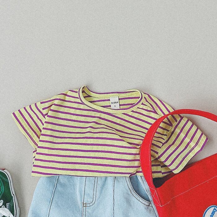 明るいカラーのボーダーTシャツ。